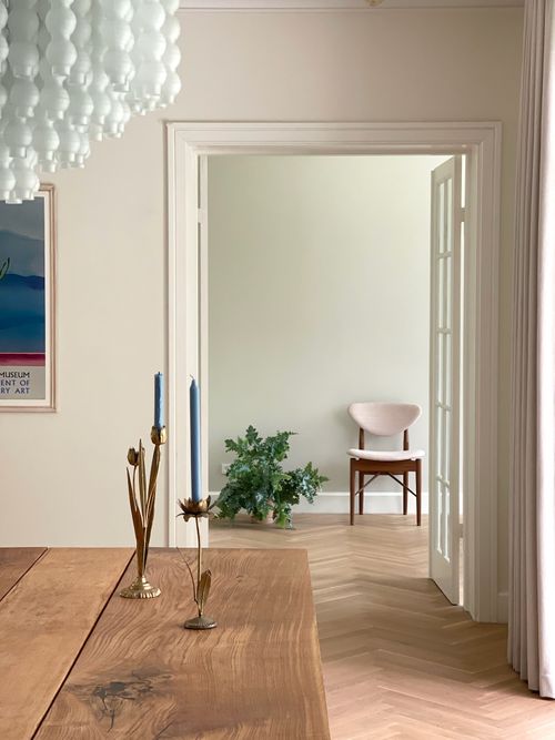Den store flotte hall fortjener særlig fremhævelse, hvilket vi understøttede med bl.a. et elegant marmorgulv indkøbt i Italien, vintage Murano lysekroner, masser af skjult opbevaring samt fine detaljer som; særlige greb, fine messing accessories mv. Desuden valgte vi et fint farvetema, hvor væggene er pastelblå, hoveddøren meget mørkeblå og trappen himmelblå.