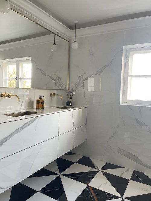 Art deco stilen fornemmes blandt andet i masterbad med sit sort- hvid tema med marmor-look på både vægge og gulve. Gulvets mønster, skabenes udsmykning med buede fræsninger samt vaskemøbels stil med lamper og stort spejl har også tydelige art deco referencer.
